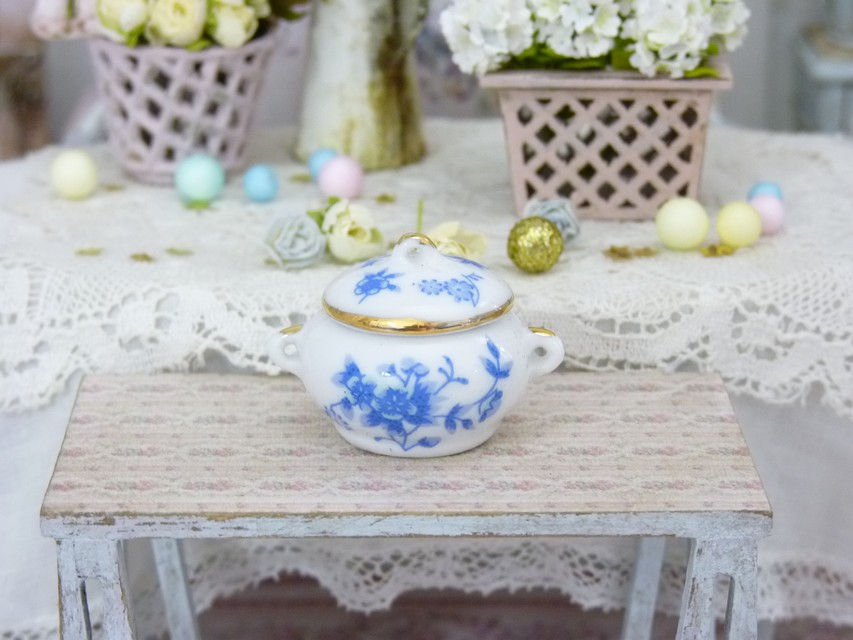 Vaisselle en Porcelaine Blanche Décor Bleu Miniature, Maison de Poupée